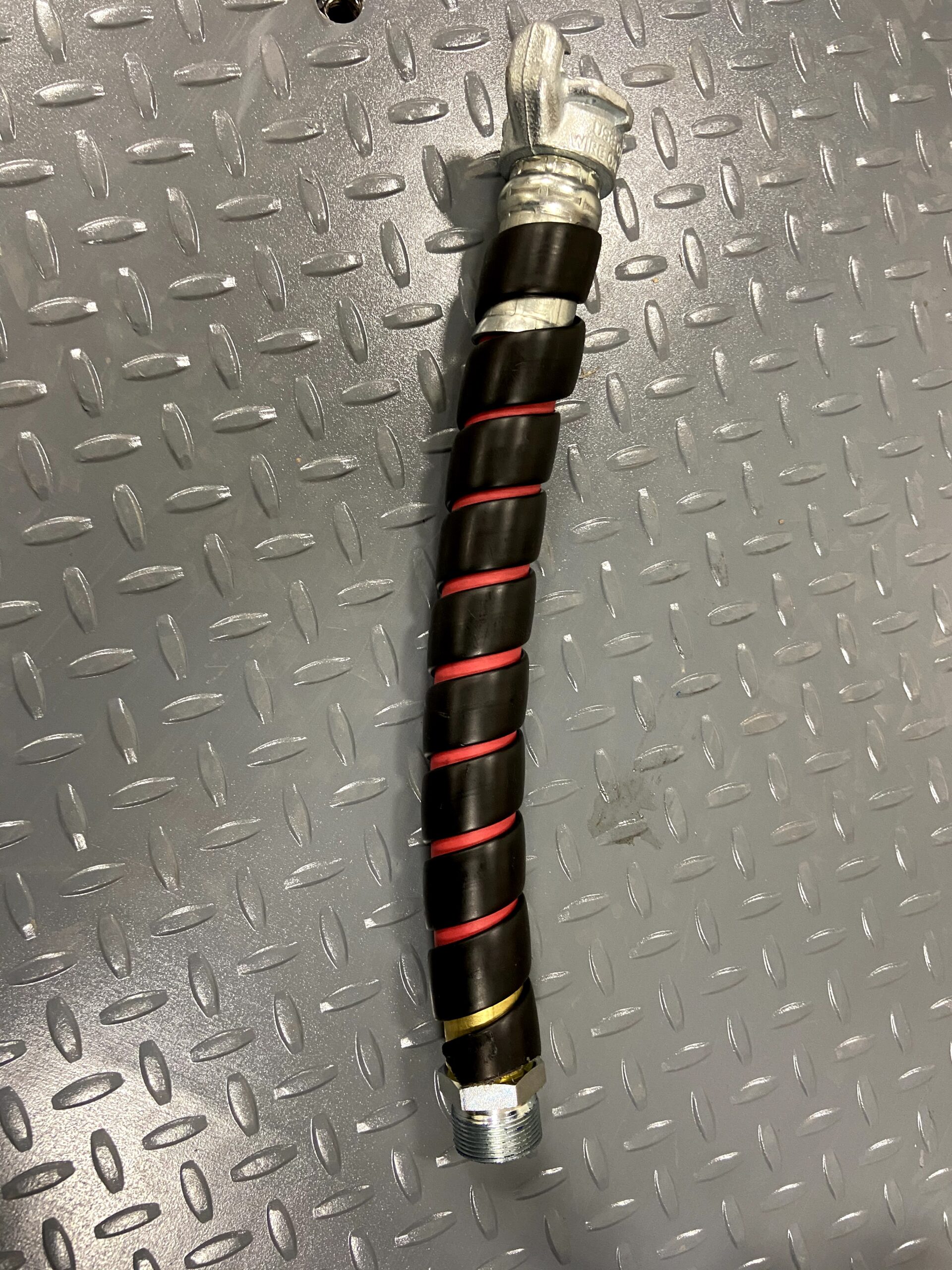 Our Industrial air hose was developed for use with our CR55 and CR65 pneumatic roller vibrators and are designed to connect your air source to the precise threading of the vibrator. This assembly features heavy-duty hydraulic fittings and a protective guard to extend hose life. Vibrator and wedge bracket not included.