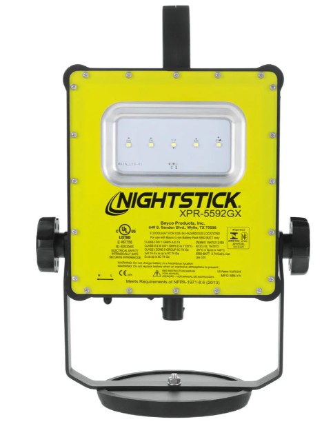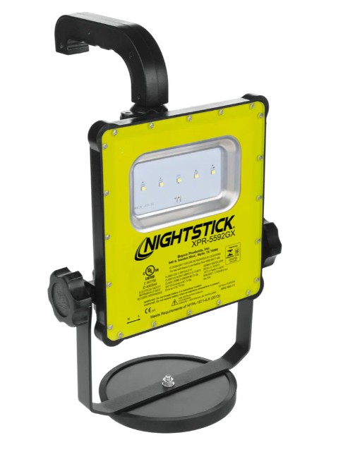 The XPR-5592GCX Rechargeable LED Scene Light Kit is ideal for use when portability is important. Zone 0, cULus, ATEX, IECEx, and InMetro certified Intrinsically safe for use in hazardous environments, the array of 5 floodlight LEDs perfectly emit an impressive 1,200 lumens on high for 6 hours, or 650 lumens on low for 12 hours when activated using the robust three-position toggle switch. This scene light has a housing that is constructed from lightweight glass-filled nylon polymer keeping it cool to the touch while being chemical, heat, and impact resistant.