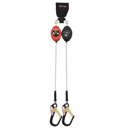 Twin legged retractable lanyard with Aluminum rebar hooks at termination end and shock pack at harness attachment end