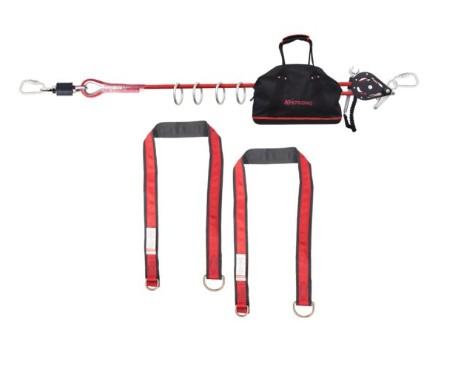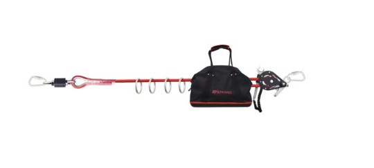 KStrong® Wrangler™ 100 ft. Adjustable 4-Person Capacity Lightweight Quick Set-up Horizontal Lifeline System. Includes installation carabiner at each end, tension indicator two (2) anchor straps and a fall/impact indicator.